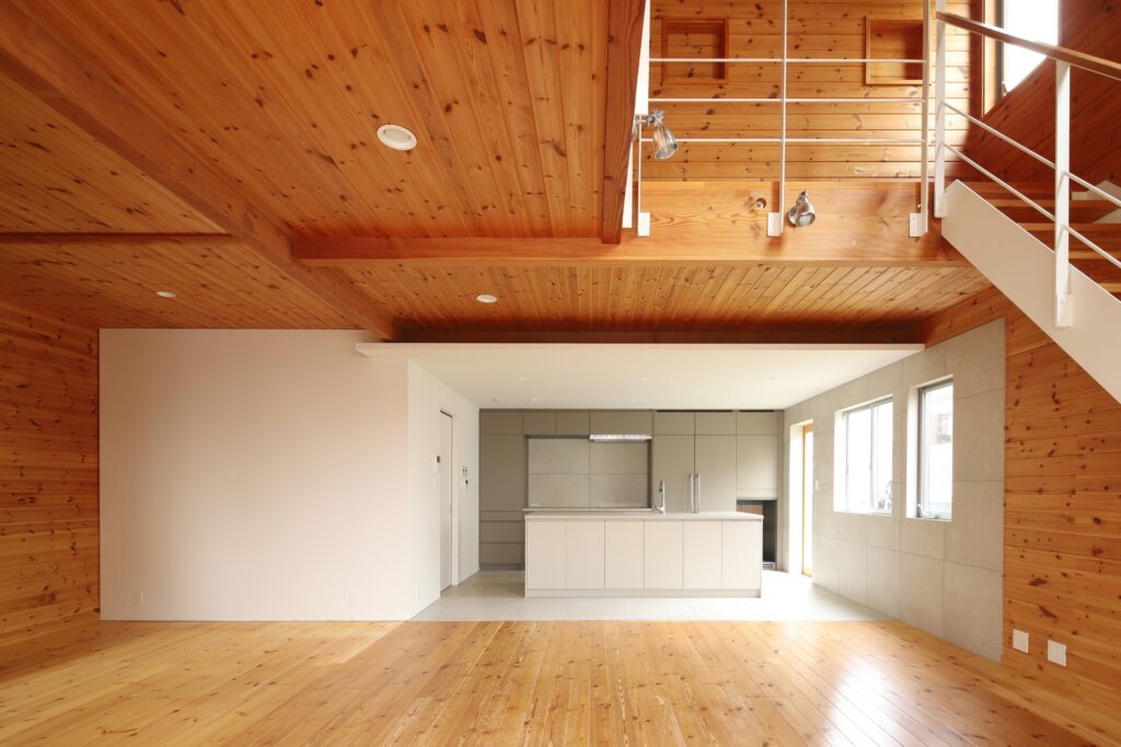 逗子の住宅リノベーション。既存の杉材に包まれた空間へ、ニュートラルかつ、内外へ広がりをつくりだす場を設計しています。